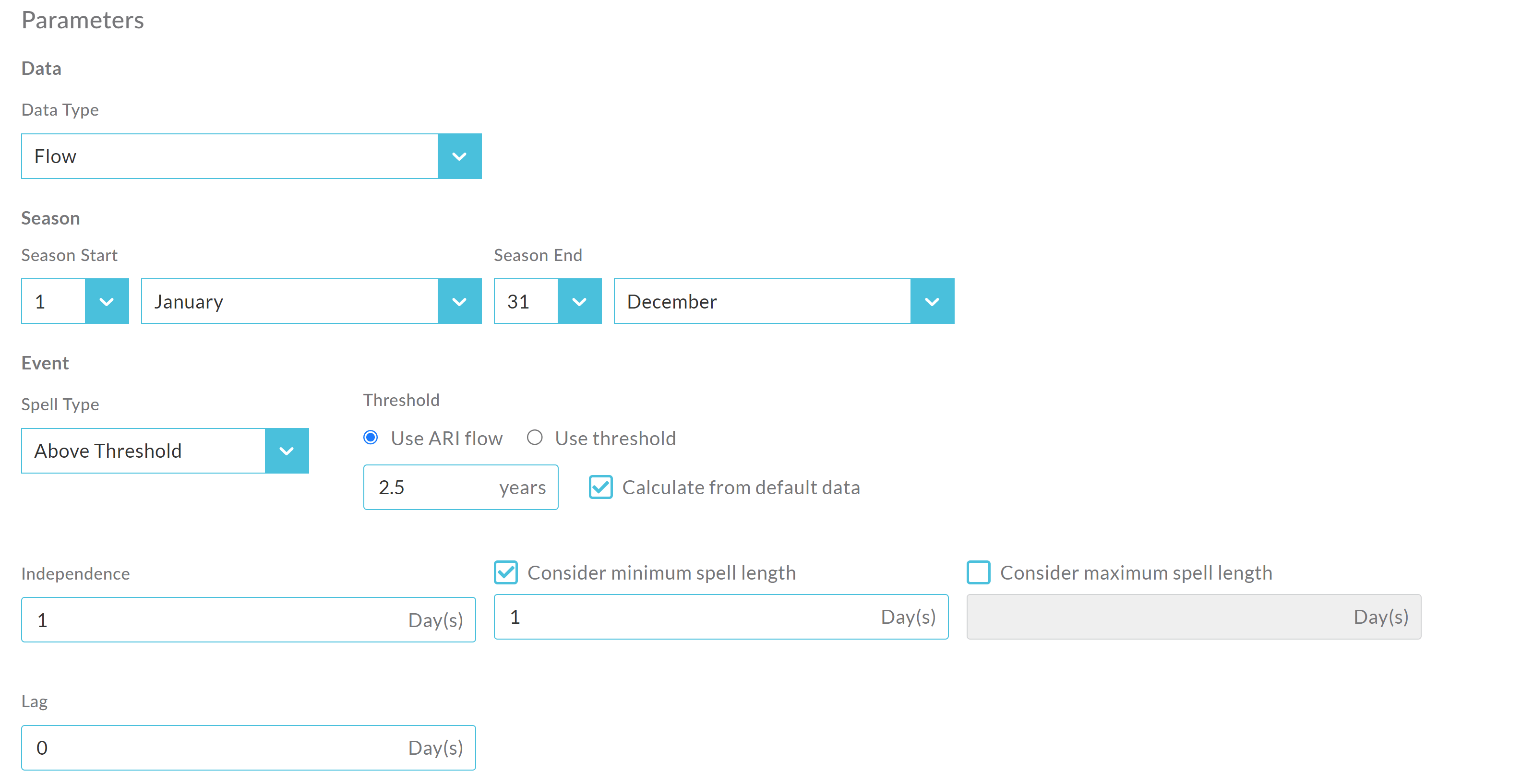 - Event – define the parameters which determine a spell event. Includes the spell type (above threshold, below threshold, range), the threshold (either a set value or the ARI value), the minimum independence between events, the minimum spell length (optional), the maximum spell length (optional) and the lag (should be specified at each location, to allow the results to be aligned for simultaneous daily analysis).