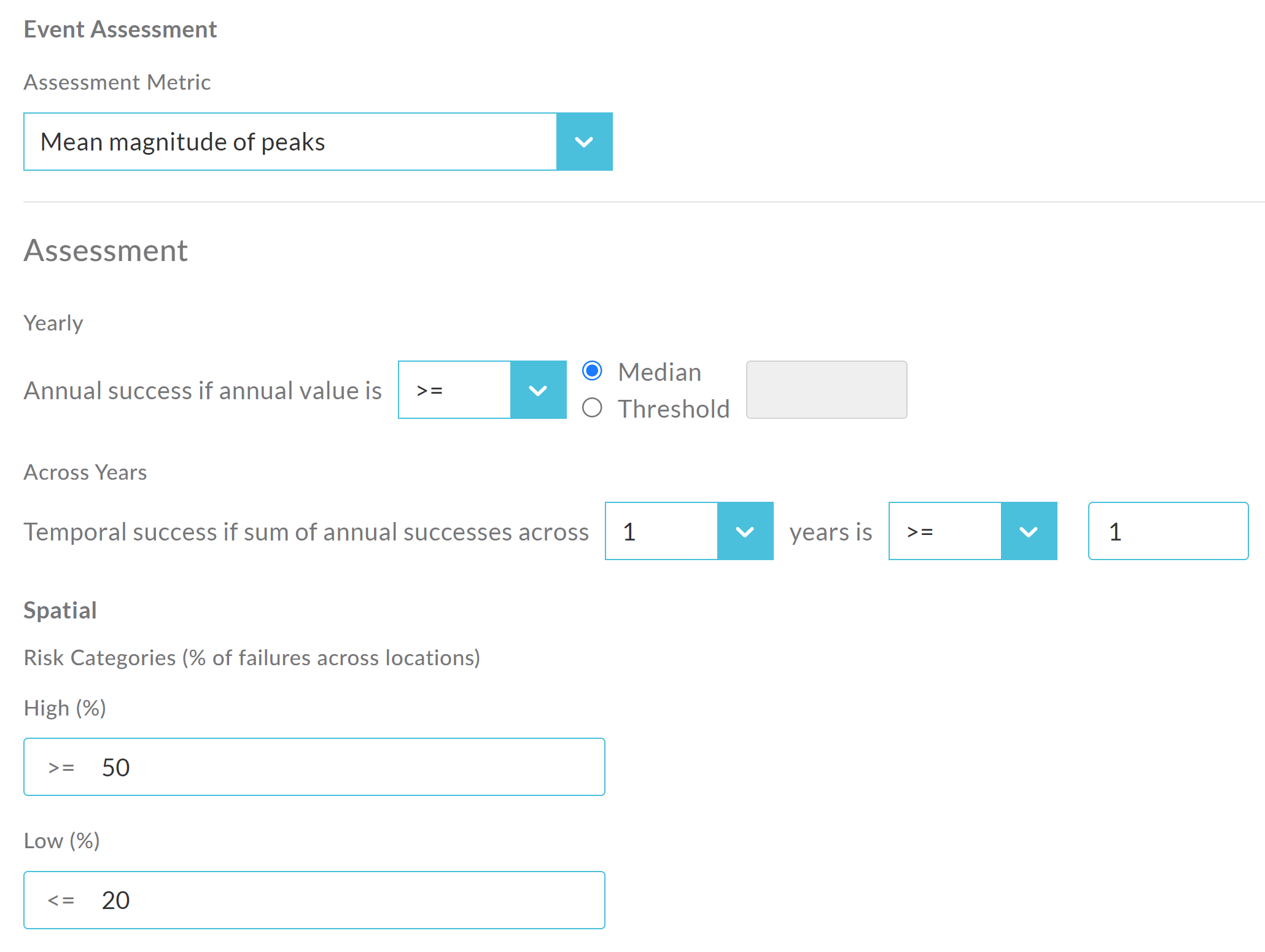 Assessment is based on one of the summary statistics (continuous annual value). The summary statistic to be used for assessment is selected via the “Assessment Metric” parameter. These results are then aggregated to a binary yearly result, then to a temporal result based on the defined assessment parameters.