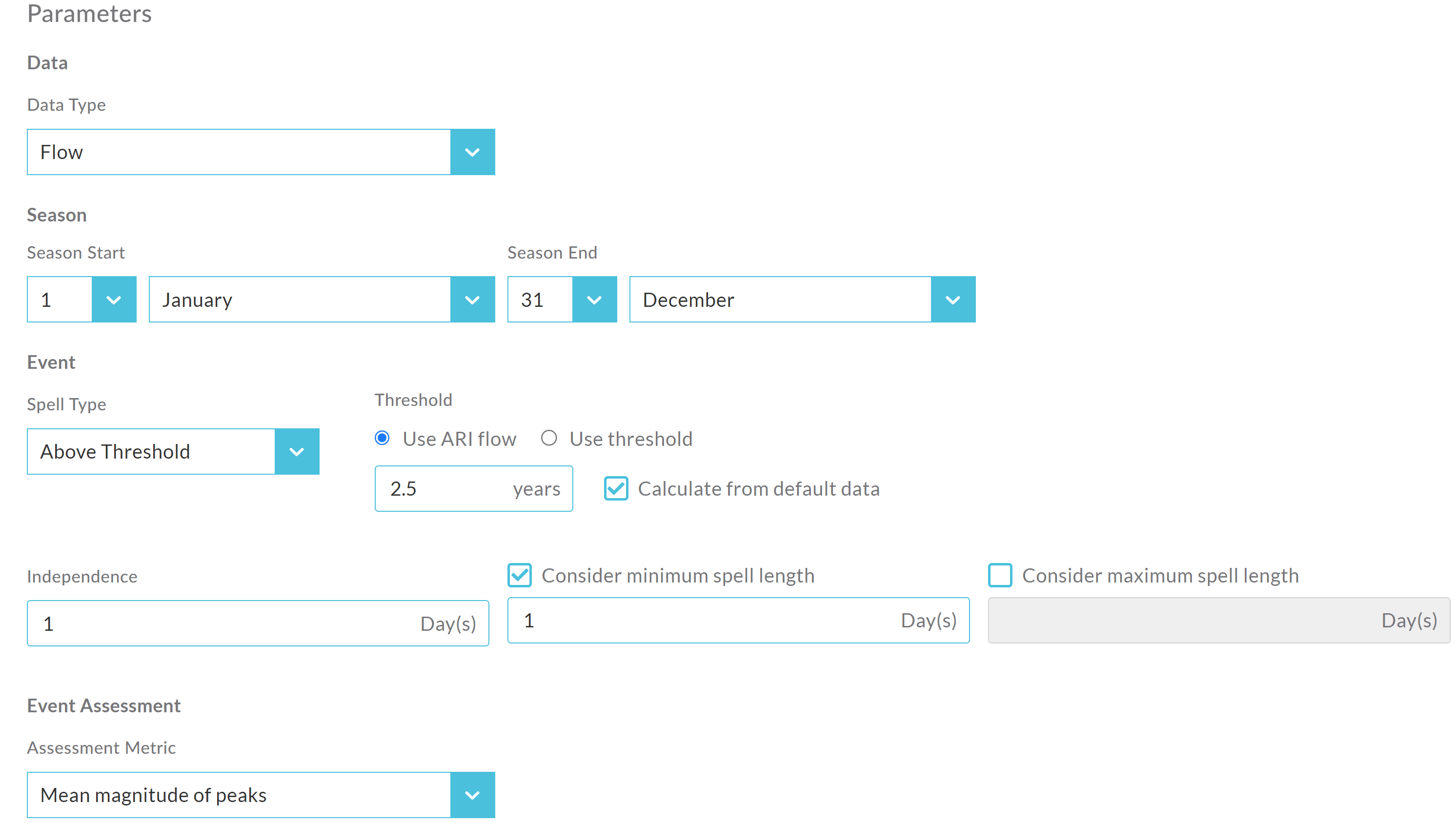 - Event – define the parameters which determine a spell event. Includes the spell type (above threshold, below threshold, range), the threshold (either a set value or the ARI value), the minimum independence between events, the minimum spell length (optional) and the maximum spell length (optional)